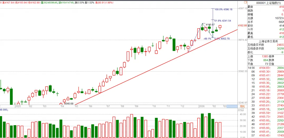 日线级别的走势其实也非常清楚,前面4190见顶以后是走了一个完整的3浪下跌调整,调整完成以后现在走的是新的上涨3浪,现在处于第3浪,目标位也可以测算出来。而上一个目标位在4223,刚好就超过了4190上方,这个测算的指导意义是假设4223满足以后能够站稳不破回4190下方,代表周线级别的突破成功,这里就会走出新的波段,个股适合右侧做多加仓;如果满足了4223以后走势遇阻,那这就是我们做波段的人的一个暂时的高抛减仓点,后续回落以后再重新买回加仓,从而达到高抛低吸获利的目的。