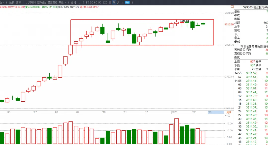 指数上其实技术分析已经讲过很多次了,最近的观点都是不变的,从主升浪的技术理论去分析,我们主力行为主升浪里推崇的是尽可能的选择主升浪或者上升趋势的结构去做,尽量的不要去在压力位上或者没有突破亦或是遇阻结构里博弈做多,那从两大指数上看,明显的大盘就是上升趋势,而且还有走再次主升浪的趋势,而创指就是箱体结构尚未突破的状态,而且目前已经在箱顶明显的走出遇阻走势,那选择上就很明显了,从我们学了这么久的主力行为学来看,肯定是选择往做大盘的行情而规避创指的。
