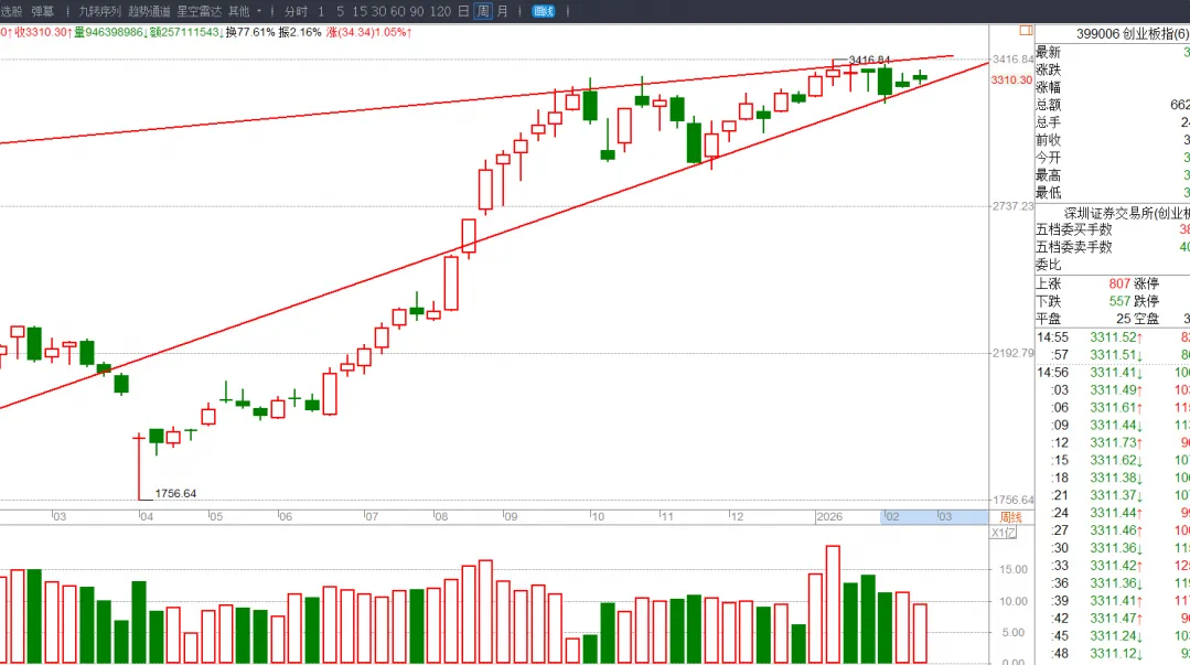从另一种画法可以看出创指现在走的是上涨楔形,这个形态相信大家都不会陌生,特别是圈子内的同学,之前已经举过多个例子,基本上都是看跌的。所以创指我觉得在中期来说风险都是很大的,最好还是小心谨慎参与创指相关的行情, 例如科技类,特别是最近已经大涨或者前期大涨最近再次急速冲高的算力产业链相关个股,很有可能是二次冲顶的诱多行情,千万不能去追高。