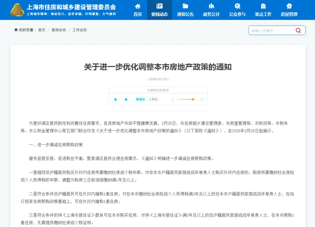 2026年春节后开工仅两天,楼市便迎来重磅信号。2月25日,上海率先发布“沪七条”新政,打响了节后限购松绑的“第一枪”。新政核心内容包括:非沪籍购房门槛显著降低——外环内社保年限由3年降至1年,持有《上海市居住证》满5年者无需社保或个税可购1套住房;公积金贷款最高额度提至324万元,多子女家庭二套可上浮20%,并实行“认房不认贷”;房产税方面,沪籍家庭成年子女置换后唯一住房暂免征。