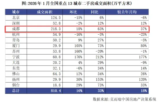 2026年1月,全国重点13城市二手房成交面积约810万平方米,环比上升16%,同比增长33%,相比上年月均增18%。成都二手房成交面积达218万平方米高居首位,环比增长18%,同比激增63%,相较去年月均增长37%(详情点击:刚开年,成都二手房交易又全国领先了)。