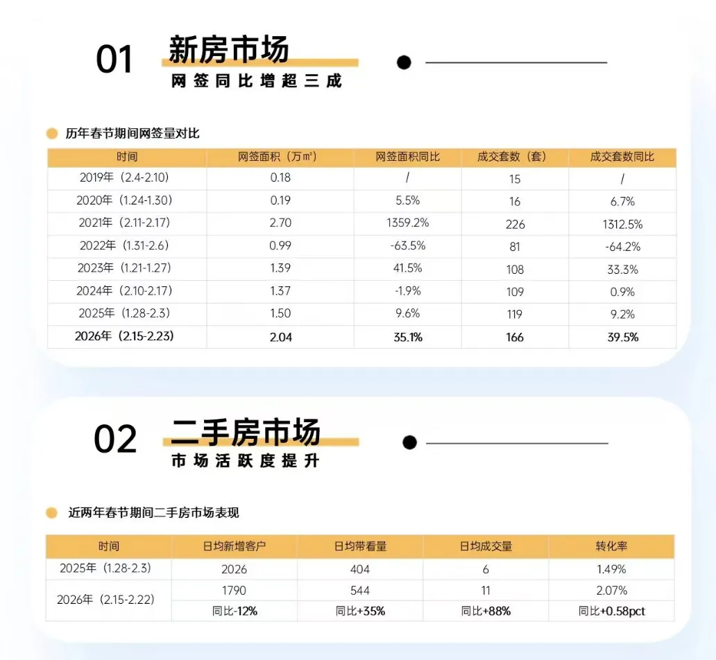 深圳新房及二手房累计网签量突破1万套,其中二手房5281套,创下近9个月新高;北京二手住宅网签1.51万套,同比增长20.8%,是2022年以来最好的开年;上海二手房成交22834套,连续第三个月站上2.2万套关口,创下近5年同期新高;广州二手住宅网签8881套,环比稳中有升,核心板块去化明显提速。
