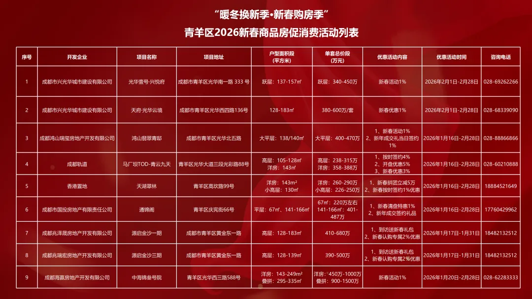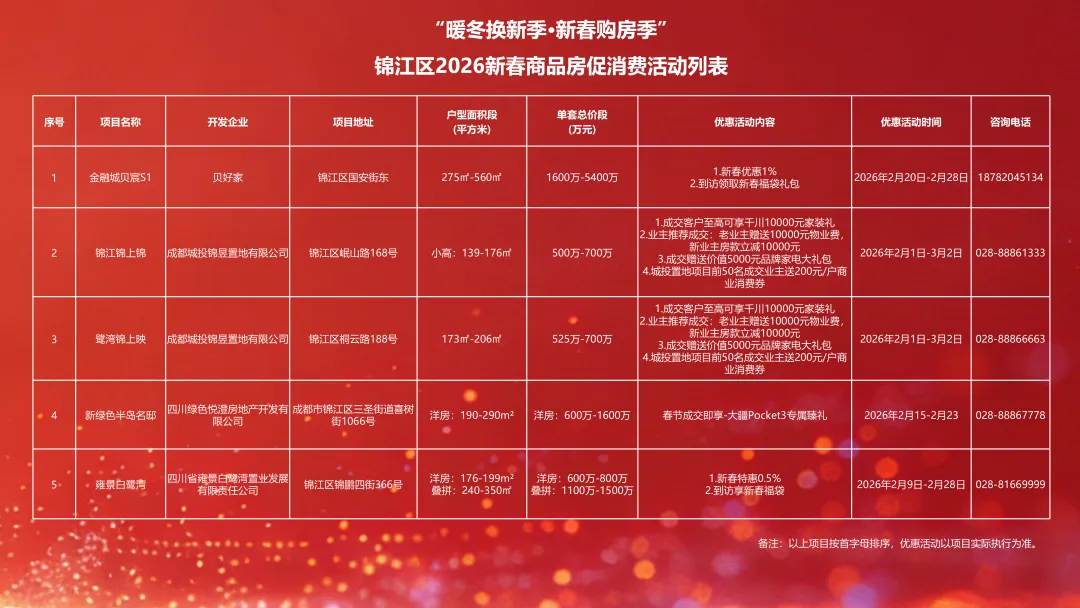 ◎招商蛇口:招商蛇口成都公司以“新在一起”为主题,通过线上线下联动实现了新春期间的品牌高效触达与销售转化。期间,各项目累计成交50套,总金额达2.5亿元;通过52场跨界直播,收获超15万观看量,有效导流客户到访。同时,其五大花园城在春节期间接待游客超50万人次,实现了居住与商业场景的深度融合。