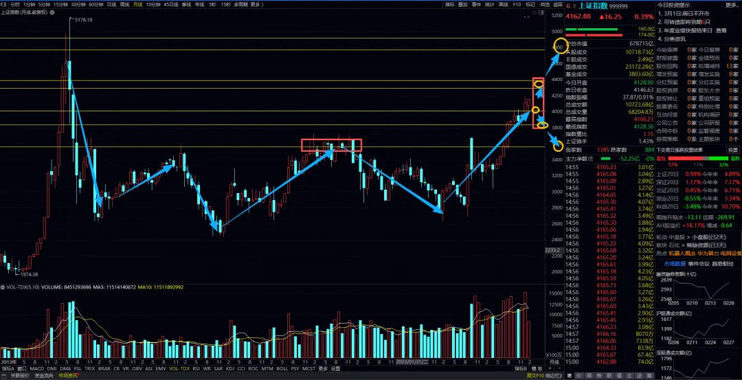 上证指数月线标注图,3580-《3830-4000-4300-4400-》4800-4930。月线结构图表上走势呈现稳中加速走势,3830上方维持强势,4000为相对平衡位置。