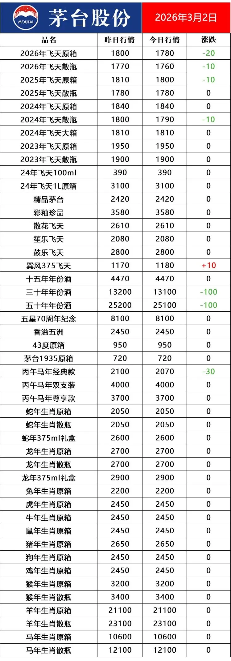 最新,茅台飞天价格全线下跌!3月2日行情价