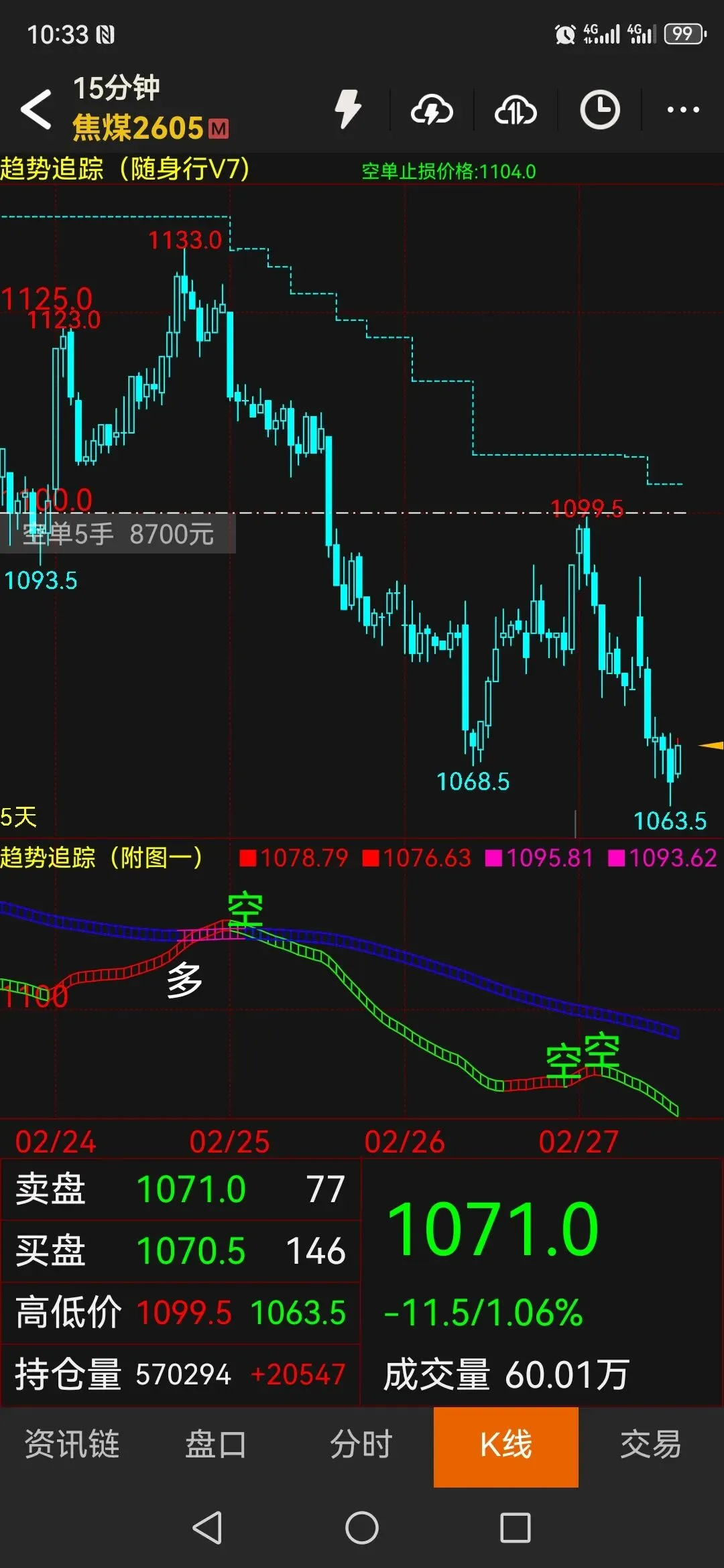 今天是2026年03月02号星期一上午,焦煤我们之前在1100做的空,止损继续下移到1105,行情上周五从1068反弹至1100,今天上午的上半段因为周末消息面的刺激挑空高开,但高开以后又开始走下跌,直至前期低位1068,这个低点我们之前就有又讲过,是形成V型反转的低点,这种形态是很容易直接上去,如果一旦行情又回落这个位子,其实支撑就很弱,就很容易直接下!