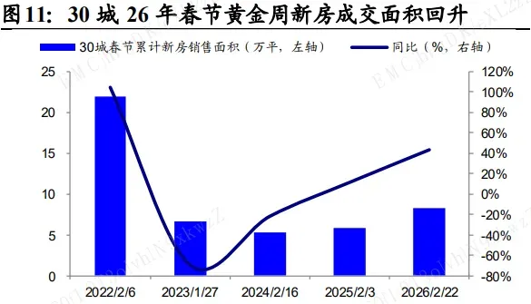 30城26年春节黄金周新房成交面积8.31万平,同比25年春节黄金周43.2%。其中,一线城市1.14万平,同比25年春节黄金周80.9%。二线城市6.55万平,同比25年春节黄金周45.3%。春节黄金周的市场成交出现回升。我们认为,26年以来市场整体成交有回稳趋势,看好优质企业未来的高质量发展。开源证券:楼市延续筑底行情