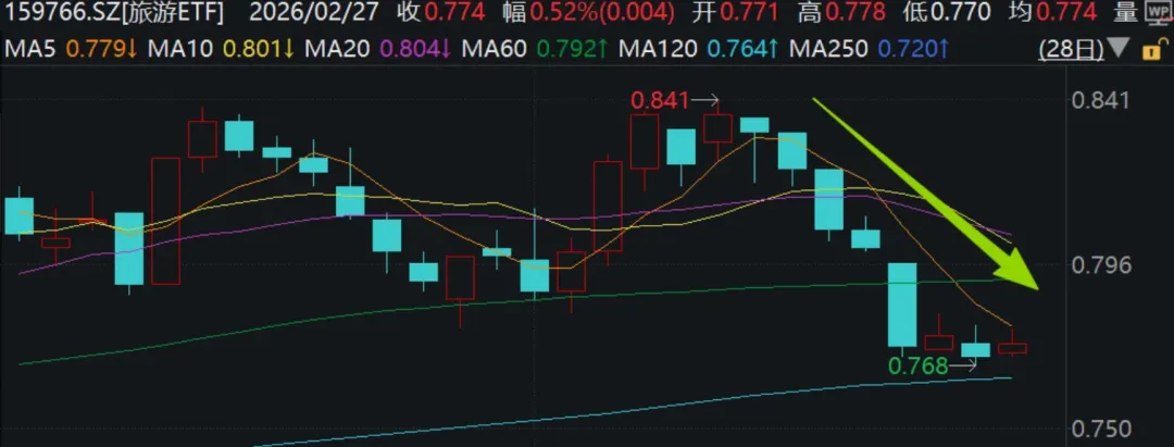 虽然高频数据来看,旅游的热度不低,但旅游ETF同样也是一路回调,勉强在半年线附近稳住。