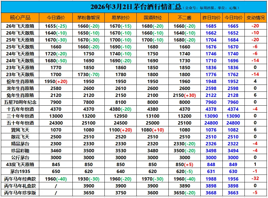 飞天茅台:2026年原箱均价大跌20元至1665元;散瓶均价下跌10元,报收1652元。2025年原箱大跌20元至1684元;散瓶下跌6元,至1670元。2024年原箱下跌6元至1740元,散瓶下跌14元至1696元。