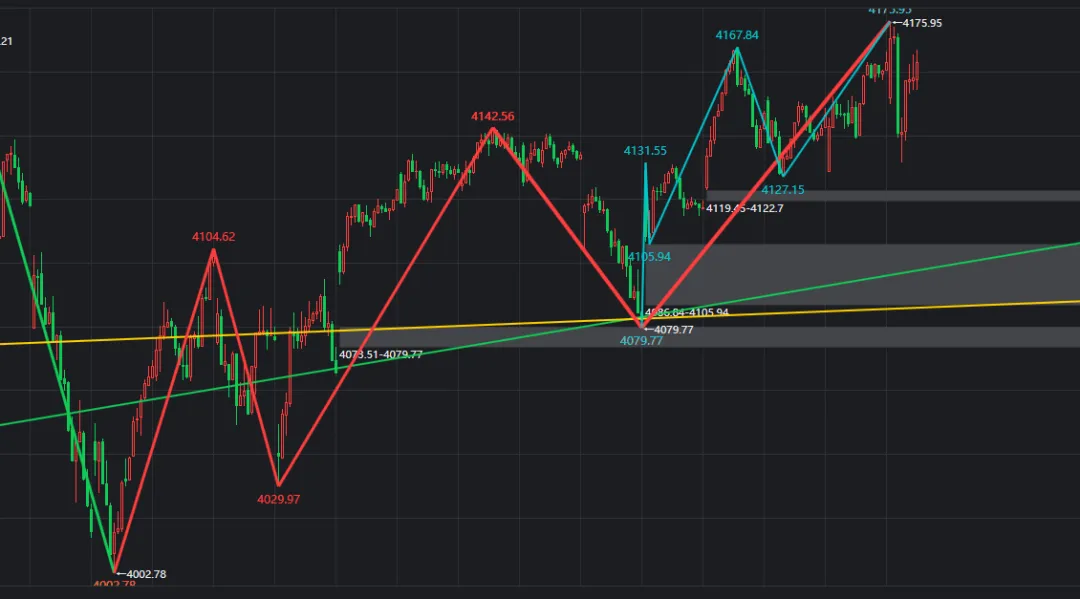 如果比较担心的人,以上午最新的走势,是可以把“0.5条”底线的那个折腾点由4079.77往上提到蓝2的低点4105.94或者蓝4的低点4127.15了,这样防守就做的更细致。