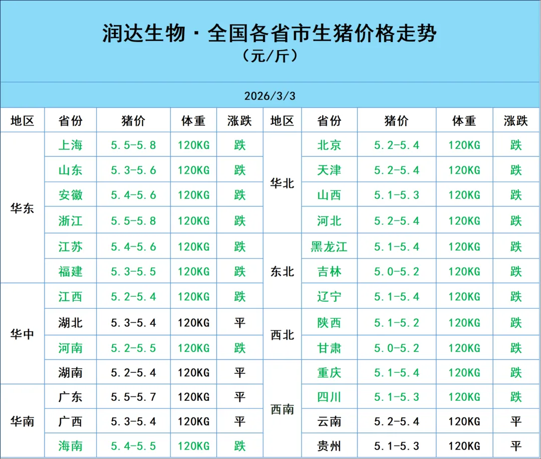 >2026年3月3日明日猪价行情:猪价全线飘绿!