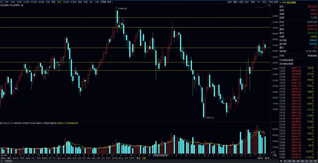 恒生指数月线图,《24000-26500-30000-31800》。月结构图表上走势处于持续加速阶段,真的有所增大,26500位置为平衡位置,注意该位置附近的波动和力度变化。