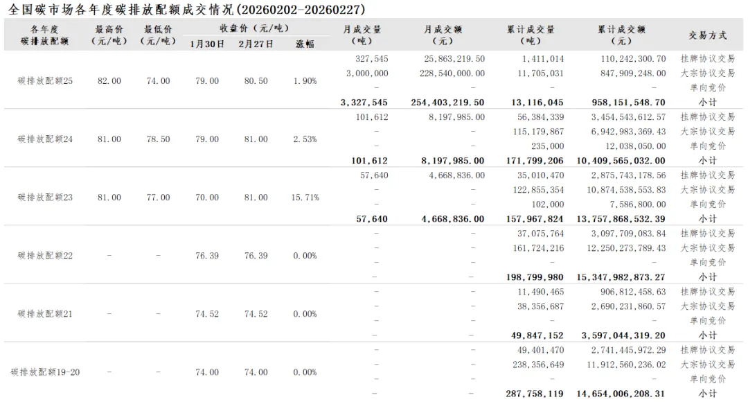 2026年1月1日至2月27日,全国碳市场碳排放配额成交量14,421,806吨,成交额1,062,000,282.30元。