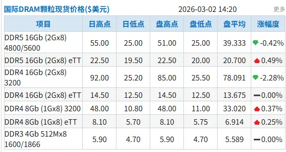今日国际DRAM颗粒现货价格整体变动不大,有涨有跌,幅度较小。其中DDR5 16Gb (2Gx8) 4800/5600下跌0.42%,均价39.333美元;DDR5 16Gb (2Gx8) eTT上涨0.49%,均价20.7美元。