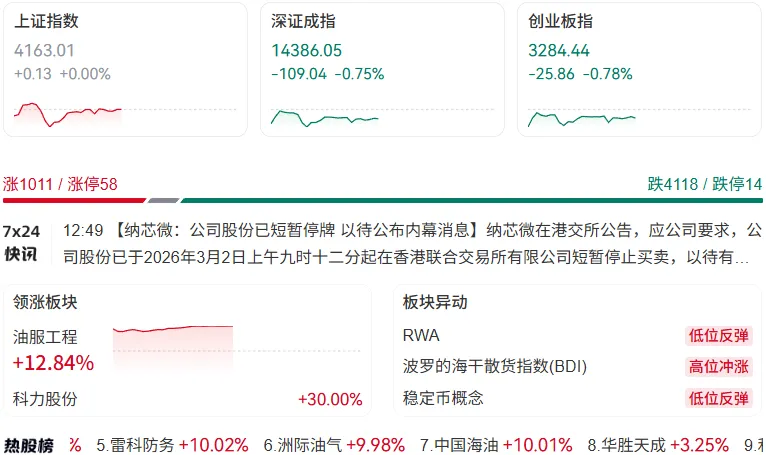 资源股:有色金属、石油、黄金等避险板块表现活跃,如北方稀土、盛和资源等个股涨幅居前。