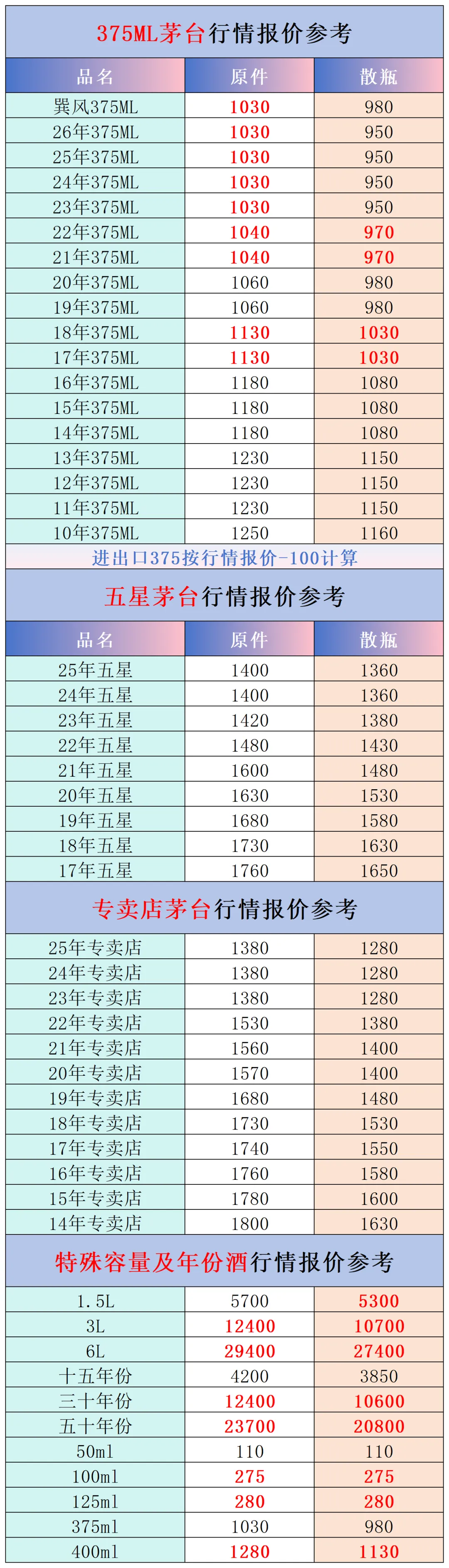 本公众号提供各种名酒回收行情报价,常规茅台、五粮液、洋河、剑南春、国缘等。所有报价根据市场买卖行情总结而来,每天更新最新报价!部分酒水每天涨跌幅较大,无法及时更新请谅解。本报价仅供参考,并非实际成交价格。感谢您的关注!我们会竭尽所能,提供更多更好的服务。