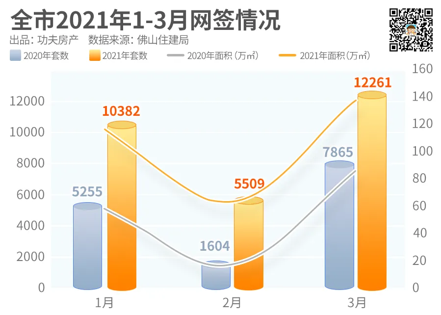 2、佛山住建局数据显示,2021年第一季度,佛山五区一手合计成交达28152套,同比去年增长了91%;成交面积达313.59万平,同比增长94.8%。而成交总金额方面,高达526.14亿,同比去年上涨122.6%。