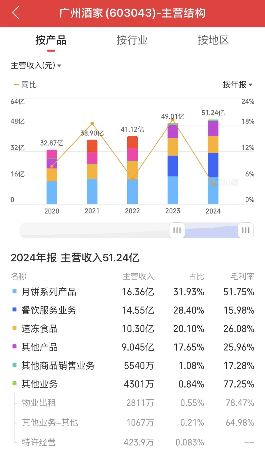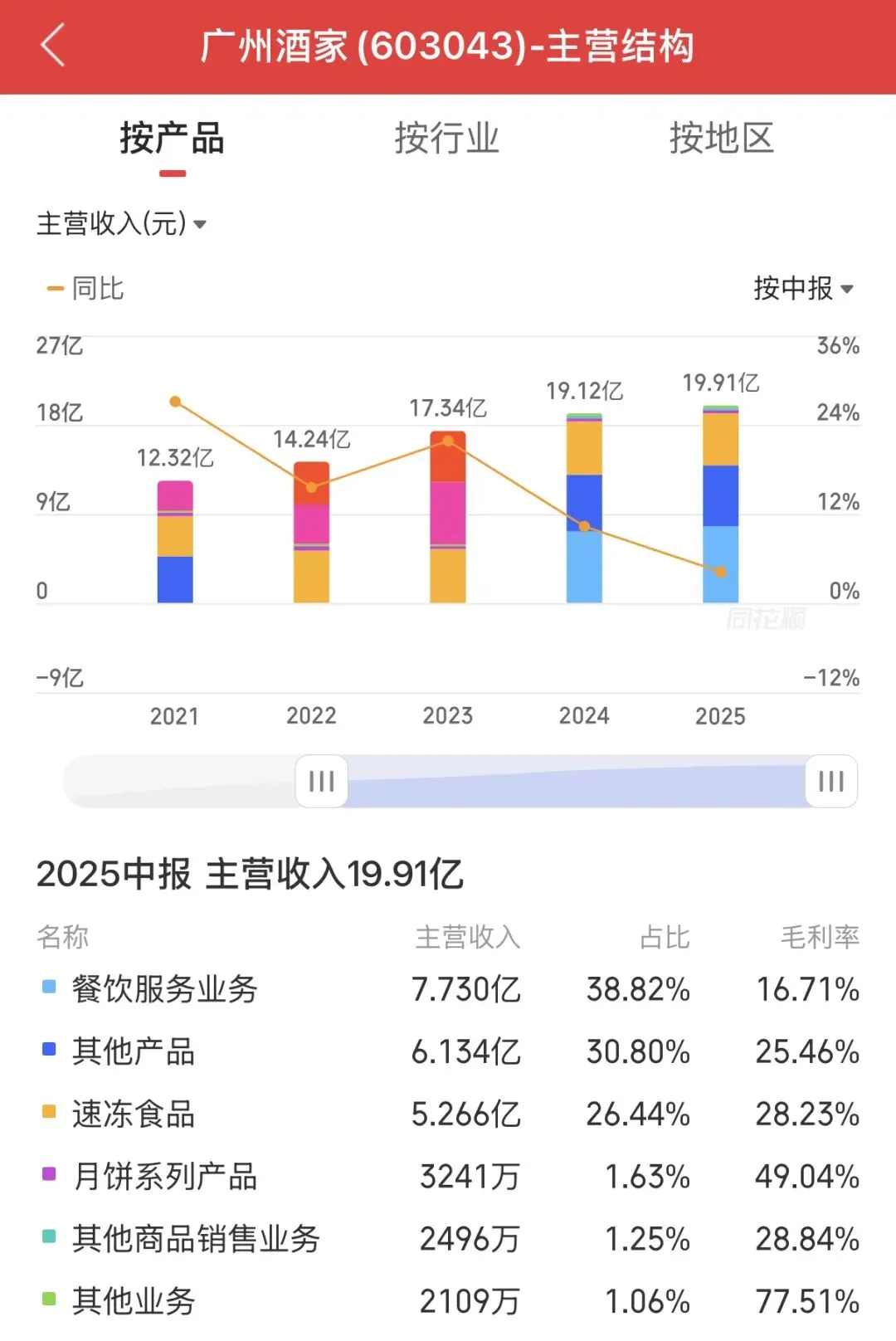 广州酒家的月饼和冻品业务也是增长有限,毕竟目前的经济形势下,礼盒消费也是在大幅度降低,而它的冻品业务实际上在行业市占率属于是其他类别,它整体成长性是比较一般,期望它的业绩爆发是不太现实。