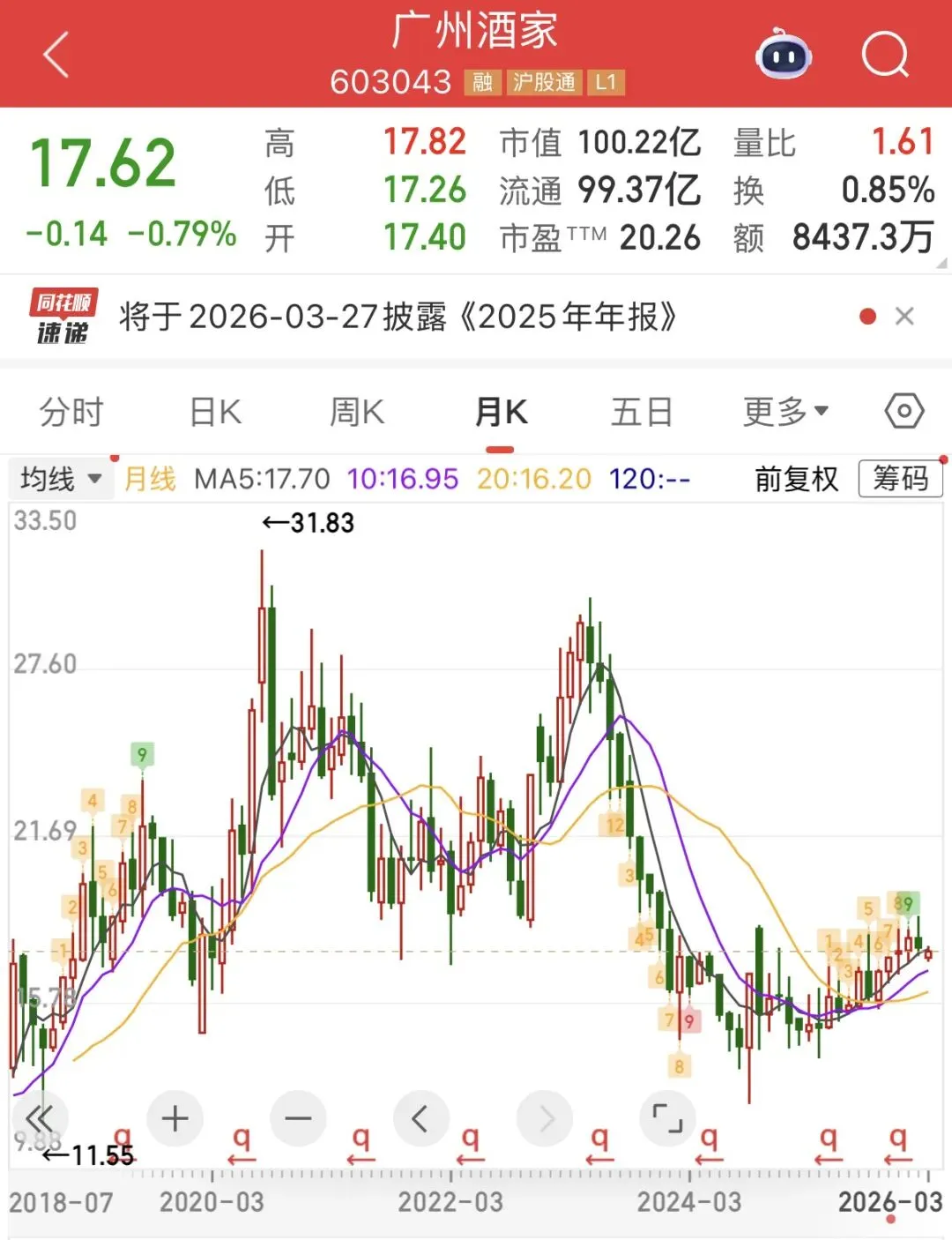 月饼在2024年是可以占到整年营收的三成多,而且这部分业务的毛利率也是最高的,能五成多,而除了餐饮外,其他业务部分则是速冻食品和其他业务是非月饼业务和速冻食品,主要是端午粽子和腊肠这些。广州酒家能蹭上世界杯的概念就是餐饮和速冻食品,餐饮主要是早茶,广州酒家旗下的陶陶居在国内主要城市都有分店,而且知名度也是比较不错,而世界杯有七成的比赛都是早上举行。此外,广州酒家的冻品也多为粤菜点心,这块业务也是早餐时点主要消费场景,也符合世界杯早上赛事。广州酒家的股价从月线看,它的股价已经从历史高位腰斩了,而它的股价目前也接近阶段性底部,广州酒家的股价目前有企稳态势,它的股价有向上走的趋势。