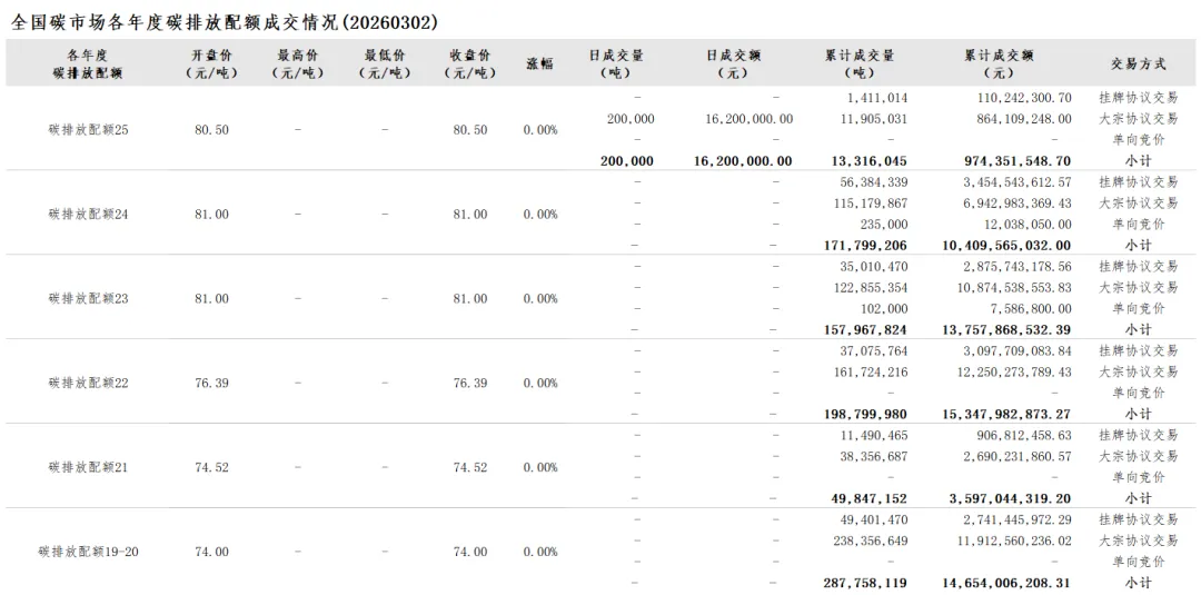 当前位置:首页>行情>行情 | 全国碳市场每日综合价格行情及成交信息20260302