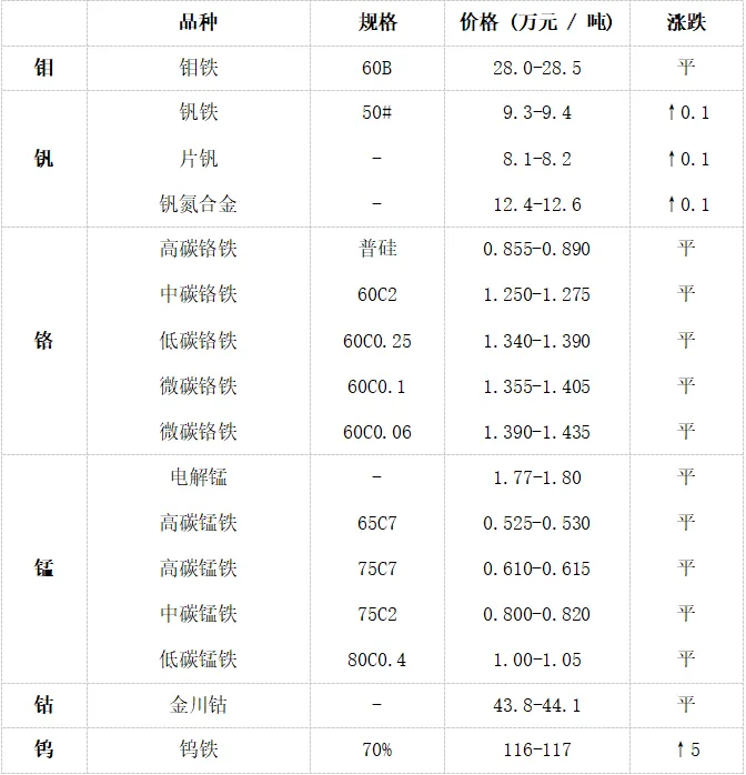 今日导读:钼价平稳,钒价继续走强,钴价持平,锰价坚挺,铬价持稳,钨价继续攀升。