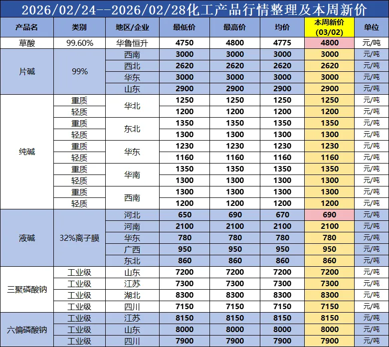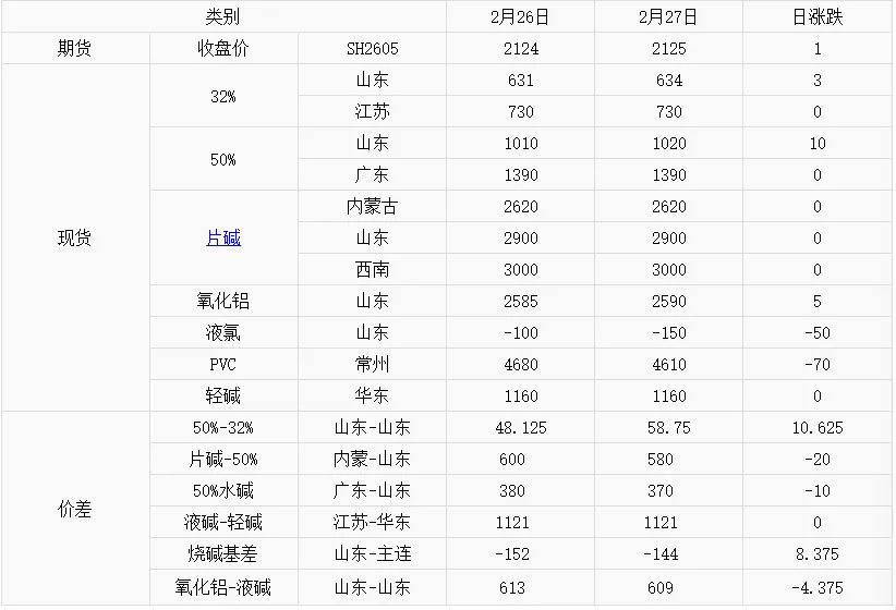 烧碱产业链价格及价差表