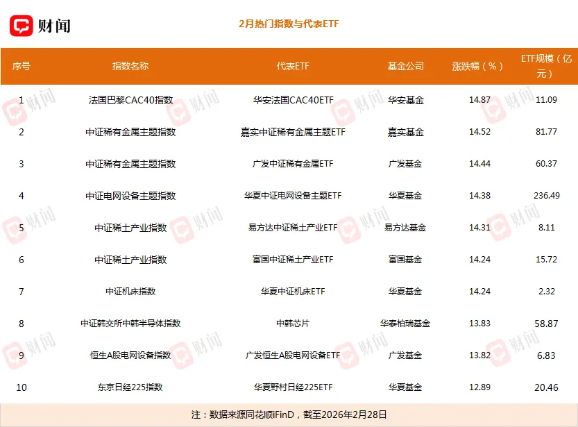 2026年2月ETF涨幅榜数据显示,华安法国CAC40ETF当月上涨14.87%;跟踪中证稀有金属主题指数的嘉实中证稀有金属主题ETF、广发中证稀有金属ETF单月涨幅分别达到14.52%、14.44%;作为以中证稀土产业指数为跟踪标的ETF,易方达中证稀土产业ETF和富国中证稀土产业ETF全月涨幅同样超过14%;此外,中韩半导体、东京日经指数等相关产品2月涨幅均超过10个百分点。