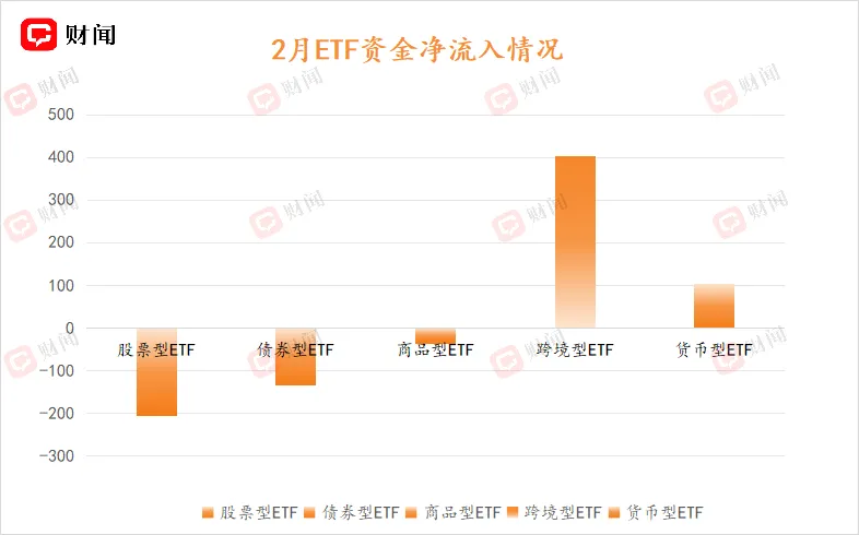 2月ETF市场合计净流入133.33亿元。分类型来看,股票型ETF单月净流出额204.53亿元,债券型ETF净流出约为134.32亿元。与此同时,QDII类基金资金流向开始逆转,全月净流入超过400亿元。