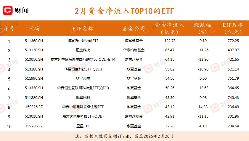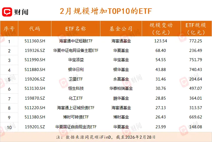 从规模增长端来看,2月资金避险情绪升温,海富通中证短融ETF单月规模激增123.54亿元,华宝添益和银华日利两只货币ETF合计增长近100亿元。