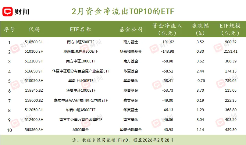与流入端形成鲜明对比的是,2月资金从A股核心宽基指数ETF中大规模撤离。南方中证500ETF单月净流出超191亿元,华泰柏瑞沪深300ETF净流出近144亿元,华夏与南方的两只中证1000ETF合计净流出超112亿元,显示资金在月末市场调整中集中从大盘及中小盘宽基指数中撤出。