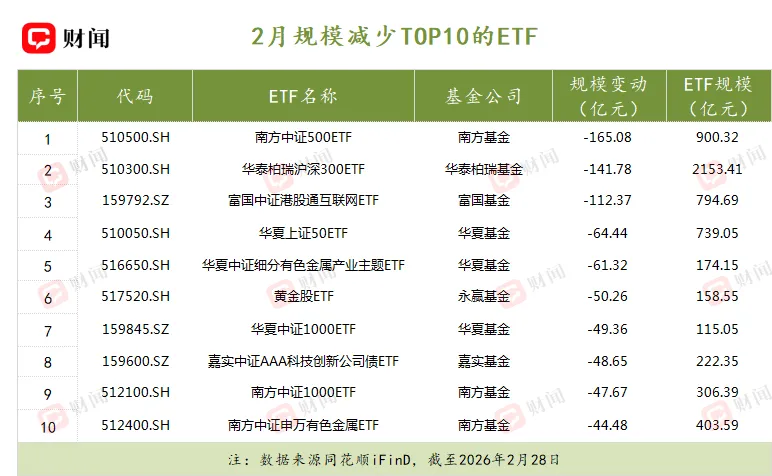 在规模缩减端,在经历1月的天量流出后,A股核心宽基指数仍被资金抛售。南方中证500ETF与华泰柏瑞沪深300ETF规模分别缩减165.08亿元和141.78亿元,华夏上证50ETF规模也减少64.44亿元。