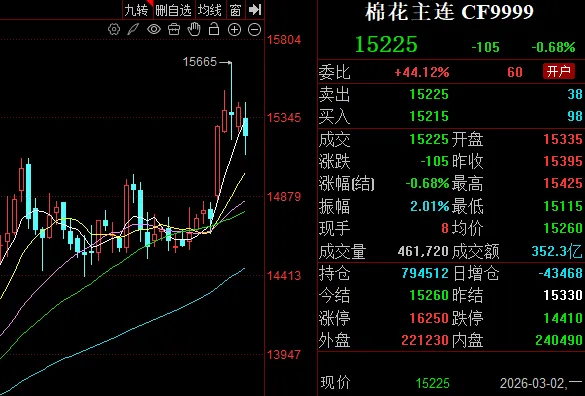 3月2日,3月的第一个交易日,郑棉主力合约收于15225元/吨,跌105元/吨。金三银四旺季即将到来。郑棉站上1.5万元/吨关口,上方空间打开,但短期内原料涨幅过大,叠加宏观风险,棉花或回落以夯实下方支撑。
