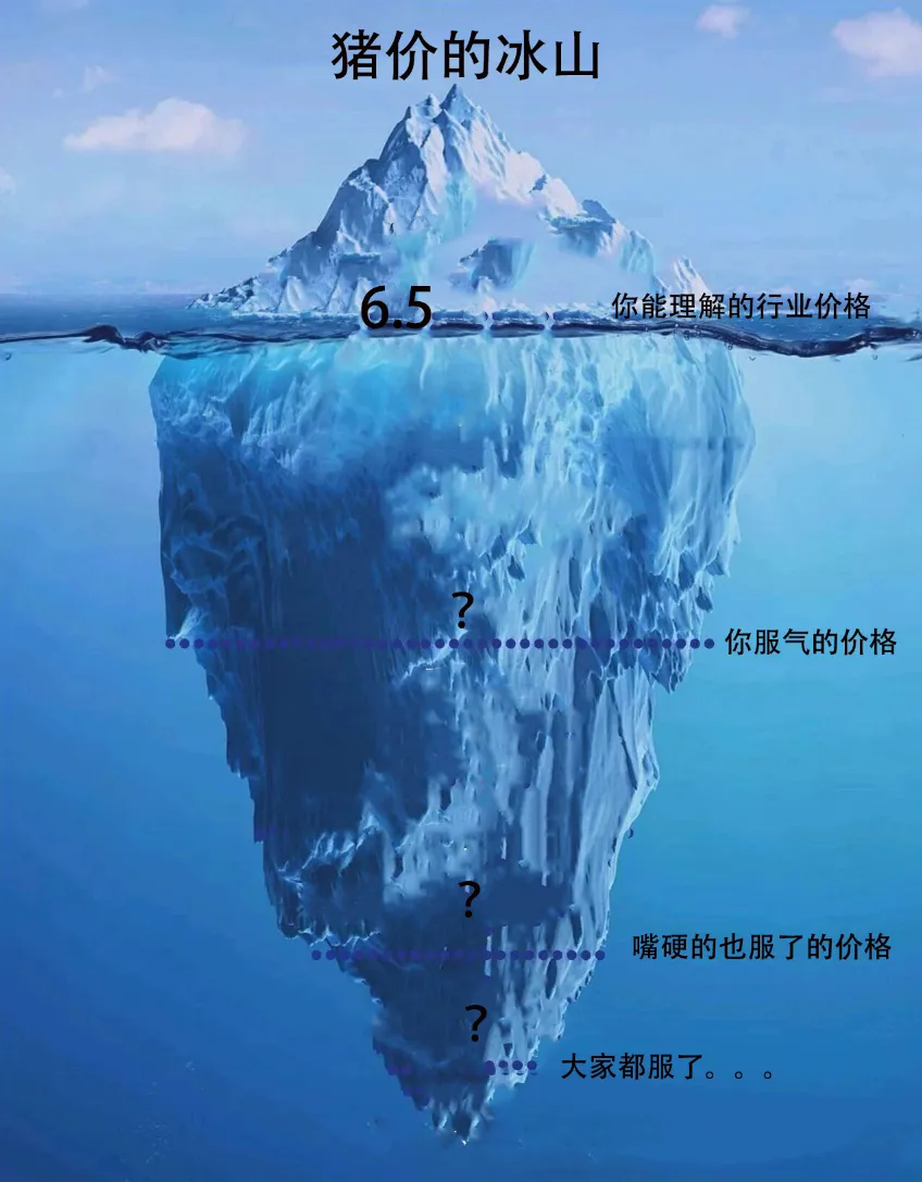 小结:首先要明白,这个猪价就是冰山的样子,有水下的,也有水上的。你还在水面上时候,能看到的就是行业的水平。然后,价格开始下跌,这会,很多人开始呛水了。然后价格继续下跌,这会,执意要养大猪的,搞二育的,因为呛水太多了,服了,但是已经晚了。如果在下跌,整个行业都得不保。