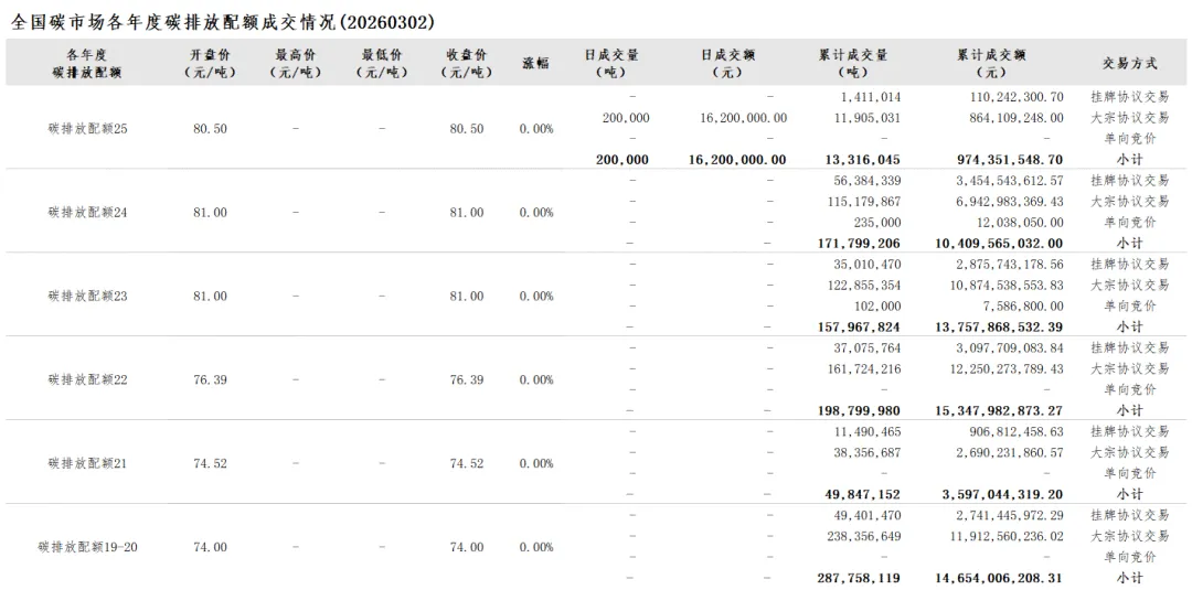 2026年1月1日至3月2日,全国碳市场碳排放配额成交量14,621,806吨,成交额1,078,200,282.30元。