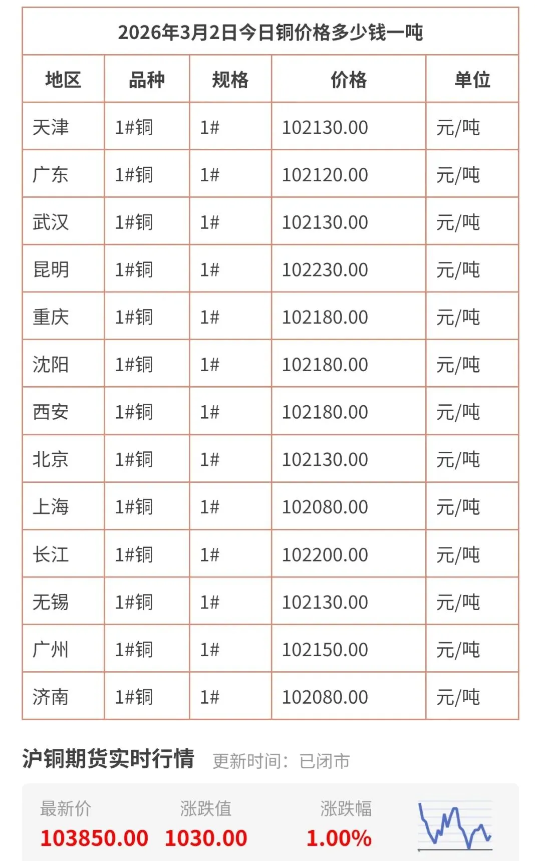 >今天铜价实时查询!现货铜价格行情走势图今日回收多少钱一斤(3月2日)