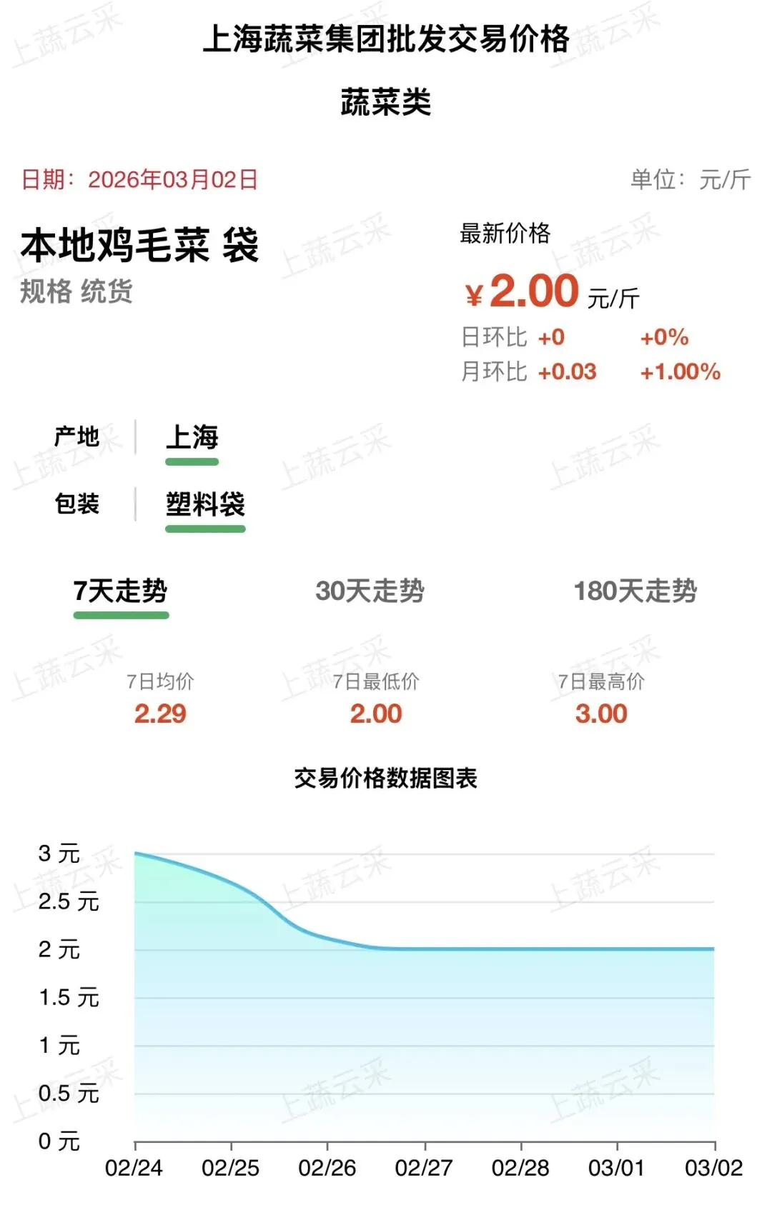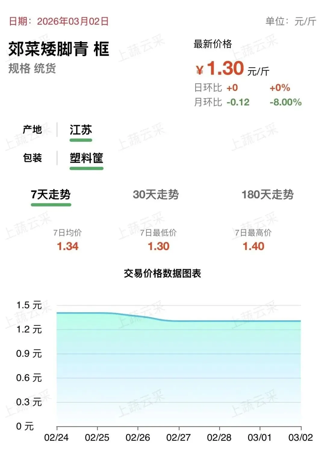 受今年春节时点较迟、节后气温适宜等有利因素叠加影响,郊菜产区长势良好,单产提升,市场供应呈现阶段性宽松格局。 鸡毛菜、青菜、太湖菜、矮脚青等主力品种上市量充足,供应端压力缓解。随着春节假期结束,终端家庭备货消化完毕,集团消费与餐饮采购尚未完全复苏,市场需求减退。 在“供大于求”的基本面驱动下,上述品种价格呈现平稳回落态势。