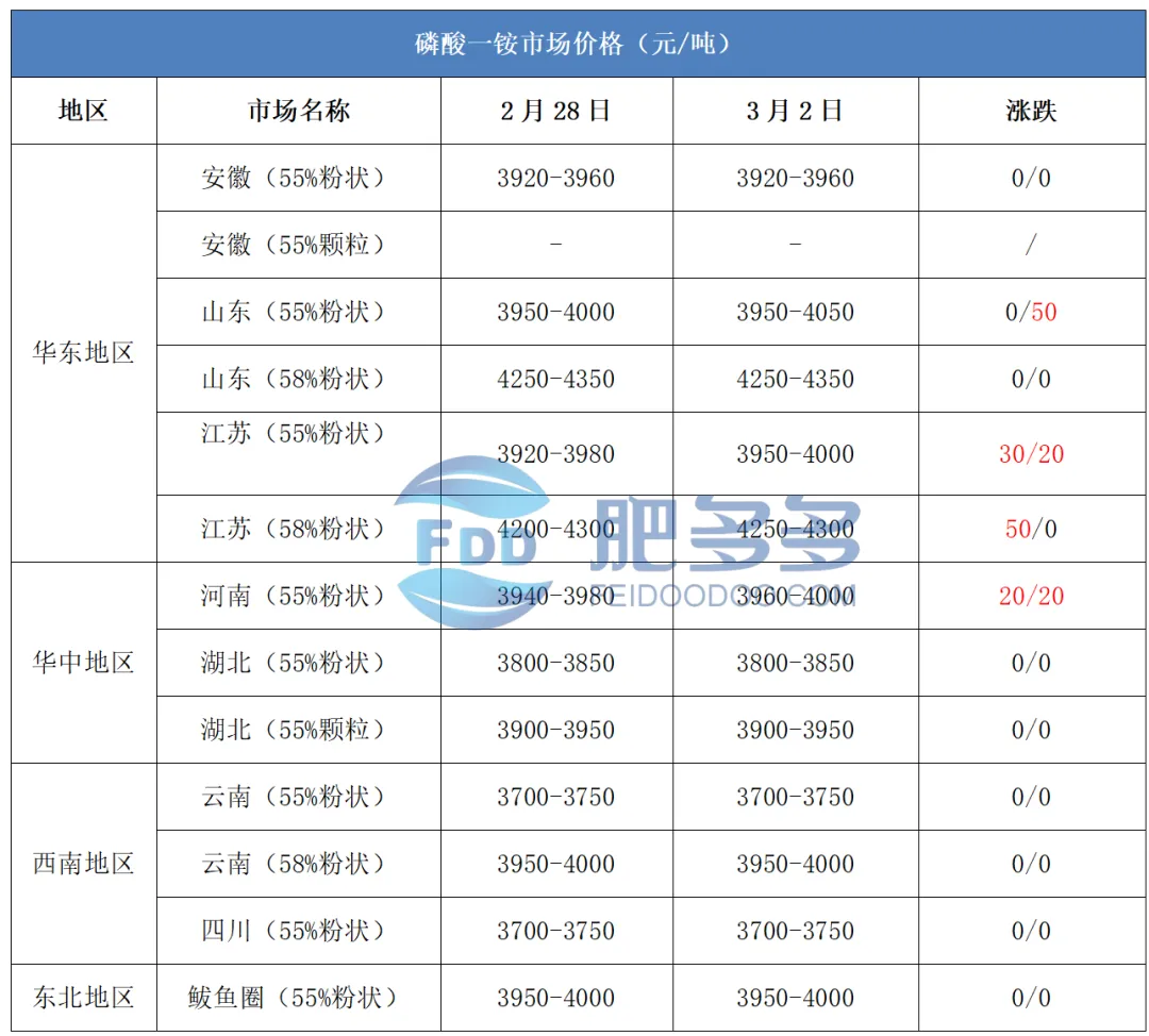 3月2日:江苏磷酸一铵市场55粉送到3950-4000元/吨附近,报价上调。