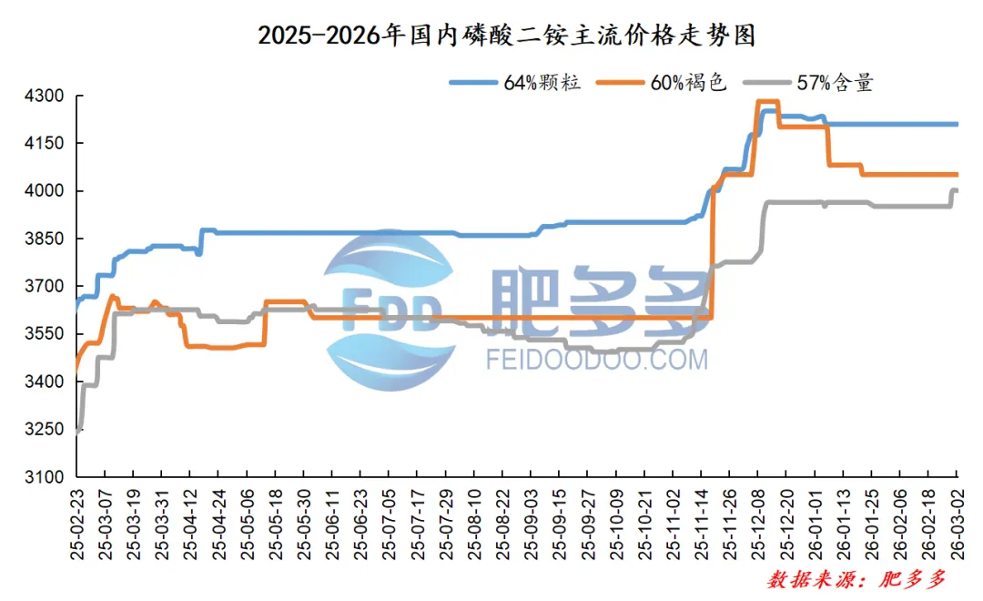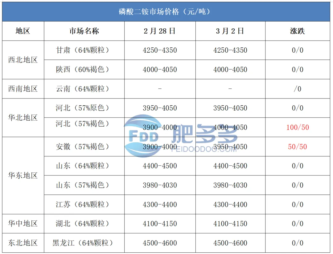 3月2日:河北地区磷酸二铵64%自提出库报价3850-3900元/吨,报价持稳;57%自提到站报价4000-4050元/吨,报价上调。