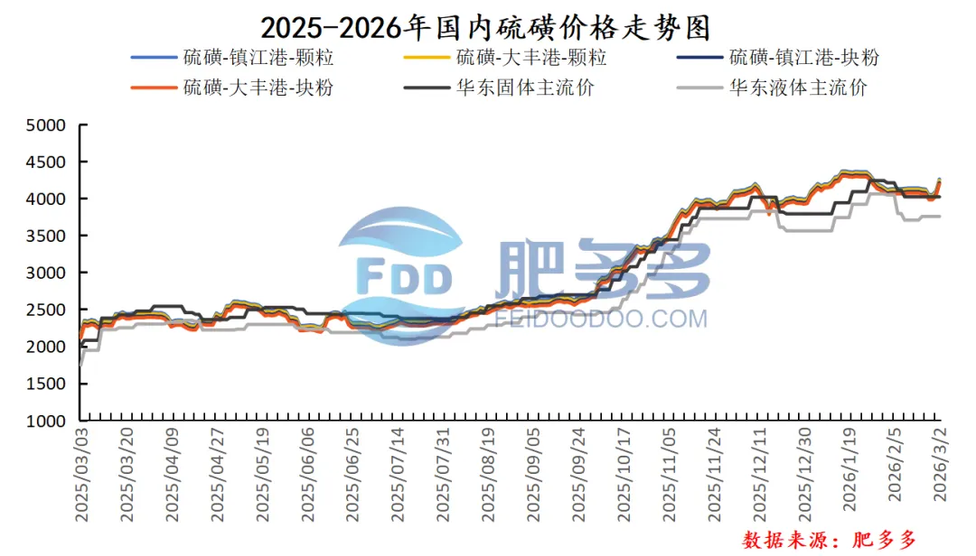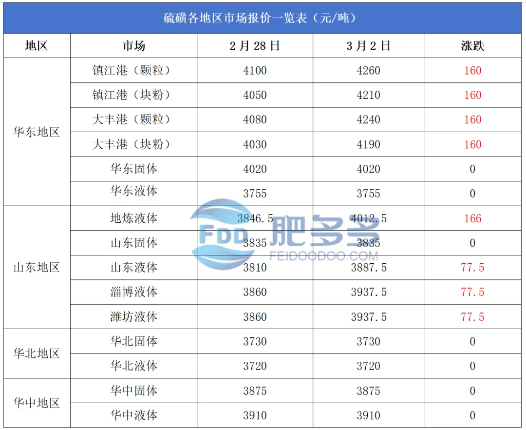 据肥多多数据测算:3月2日,国内硫磺镇江港颗粒价格为4260.00,较上一工作日上涨3.90%;大丰港颗粒价格为4240.00,较上一工作日上涨3.92%;镇江港粉块价格为4210.00,较上一工作日上涨3.95%;大丰港粉块价格为4190.00,较上一工作日上涨3.97%;华东固体价格为4020.00,较上一工作日平稳;华东液体价格为3755.00,较上一工作日平稳。