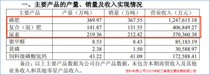 2025年前三季度,公司磷肥、复合(混)肥、尿素收入各为124.76亿元、40.68亿元和37.04亿元,相应占总收入的33.18%、10.82%和9.85%。