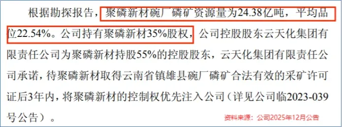 2025年12月25日,公司披露参股子公司聚磷新材取得云南省镇雄县碗厂磷矿采矿权。