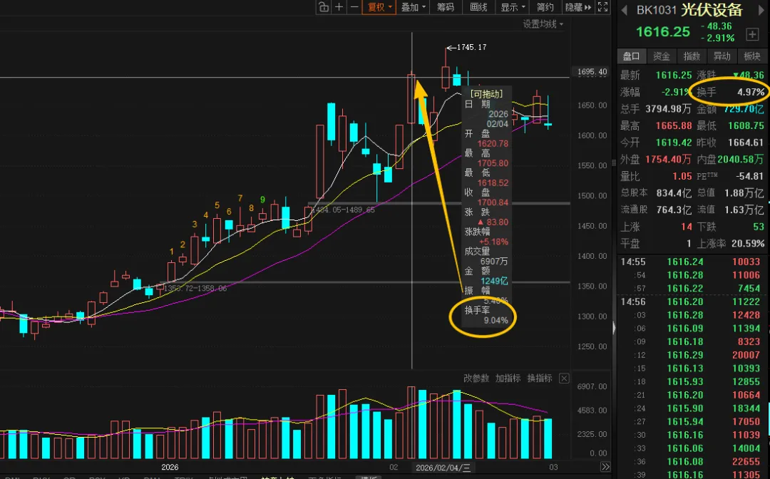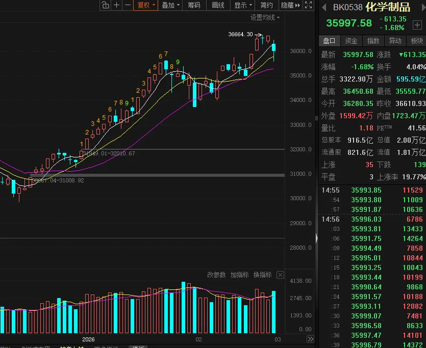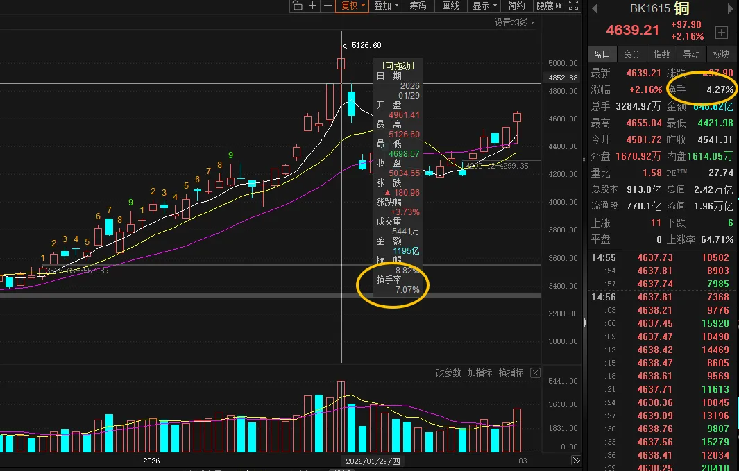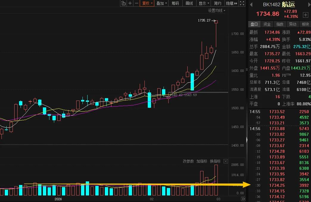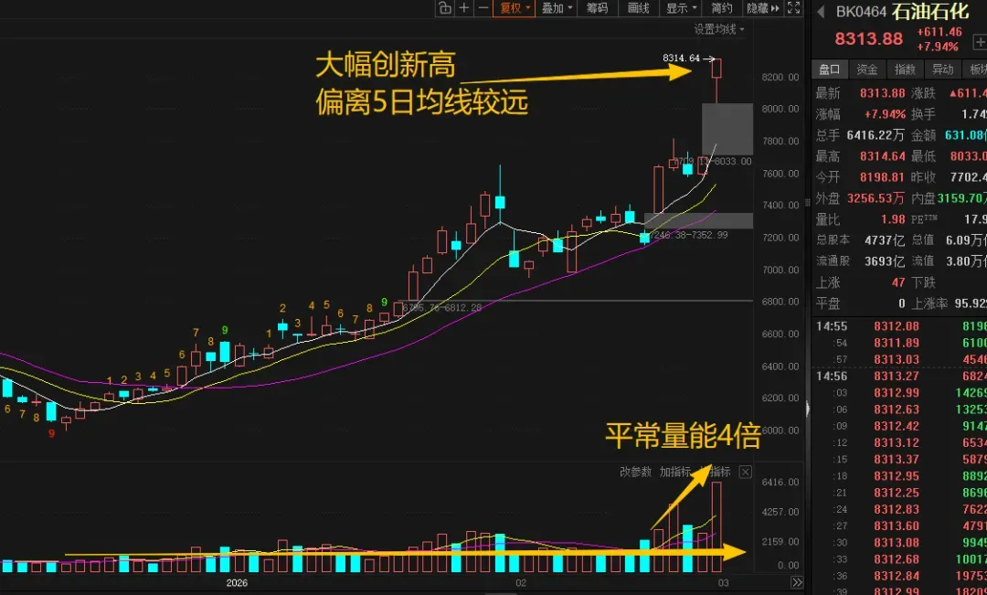 今天这行情让大家比较闹心吧,没办法,外边出了这一摊子事,这叫天有不测风云。但是今天整体市场走势跟盟主昨天直播预期的几乎一致,指数低开、低走,再高走,而且上涨的基本都是跟冲突有关的,比如油气、军工、黄金这些; 大部分散户持有的小盘股、题材股,损失是比较大的,下跌的家数超过了4200家,是个标准的普跌行情。更搞笑的是上证指数走出了一个量价齐升的局面,指数还差点创出了新高。面对这种指数和个股的严重分化撕裂行情,盟主估计大家都是懵的。恐慌抛盘大家都能理解,散户最容易恐慌了;但是这个时候来承接的是谁?今天他们收割了散户的廉价筹码,只有后期再拉升,他们才能吃肉。其次,银行今天还是创出了新低,这说明避险情绪并不是一开始就有的,当然,银行板块探底后出现放量回升,说明有一部分资金在抄底,什么资金在抄银行的底,盟主认为是那些买不进石油的资金资金。不管是承接题材的资金还是抄底银行的资金,总之实打实的成交达3万亿。不管从哪个方向来说,都可以理解为资金在加码市场。有资金的大幅加码,市场后期无忧。盟主认为,如果地缘冲突不结束,相关板块的机会还有一定延续性机会。但是我们知道冲突不会一直持续下去,做好区分对待就是当前重点。1、如果处于板块高位+高换手的,那最好应该尽早逃顶;第一,石油板块。从石油石化整个大板块看,今天的量能是平常量能的4倍多,而且板块大幅上涨后出现加速偏离5日均线,是加速赶顶的迹象。按上周五盟主给大家分享的见顶的两条标准,当前石油板块已经具备。第二,电力板块。虽然量能是平常2倍,乖离也没有石油那么恐怖,但电力本身属性就更为平稳一些。今天电力收了一根放量的上影线K,这种K线一般是转折K线。电力板块今天换手率是2.36%,往前看,只有2024年10月8日那一天的换手率2.84%超过了今天。第三,黄金。一月份黄金板块已经走出过一波非常强势的行情,见顶那天的换手率是7.41%,而今天黄金板块的换手率达到了7.66%,超过了之前高位见顶的那天。第四,远洋航运板块。这个一眼也能看得出,不管是量能(换手率),还是短期板块的涨幅和乖离率,都满足盟主上周五说的两个见顶条件。第一,特高压。特高压板块今天创出近期新高,虽然也有冲高回落,近期也处于高位,但量能不够大,换手还没有前一波大。1月20日换手率最高是7.9%,而今天才5.06%。第二,化学制品。从趋势上看,板块近期是震荡上行,整体处于高位,今天也有放量,但这个量能不如1月29日大。那天的换手率是4.93%,而今天只有4.04%,这说明今天是一个放量回调,新资金入场的时机。第三,金属铜。铜的走势跟黄金一样,是走第二波,但两者有很大的不同。1月29日前一波见顶时的换手率是7.07%,而今天的换手才4.27%,相当于之前的一半多一点。第四,光伏。光伏设备近期处于横盘调整中,位置是相对高位,但从换手率来看,4.97%的换手率也只是前一波拉升高点当天一半多。以上这四个高位+低换手板块都是延续之前的强势行情,也是大家接下来可以重点关注的方向。好了,今天就讲这么多,更多内容锁定盟主晚上8点的直播。免责声明:本信息仅供参考,不构成任何收益保证,股市有风险,入市需谨慎。订阅者如使用本信息,请自主决策或联系专业投资顾问的指导及解读。深圳市优品投资顾问有限公司 张维 A0340625030003