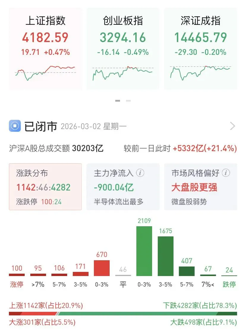 A股市场:沪强深弱、极致分化;地缘冲突驱动油气/黄金/军工/煤炭避险主线全面爆发,科技成长赛道普跌;两市成交3.02万亿放量新高,赚指数不赚钱,情绪冰点。