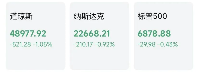 • 道琼斯:-1.05%,收48977.92,低开低走,权重承压