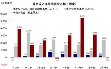 2月,恒指下跌2.8%,而恒生科技更是大跌10.1%,自去年10月高点回撤已达20%,与韩国股市年初以来近50%的涨幅形成鲜明反差。资金面作为影响港股走势的核心变量,其流向与结构变化直接决定了市场的未来走向。外资回流初现端倪,基本面成关键变量