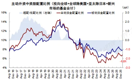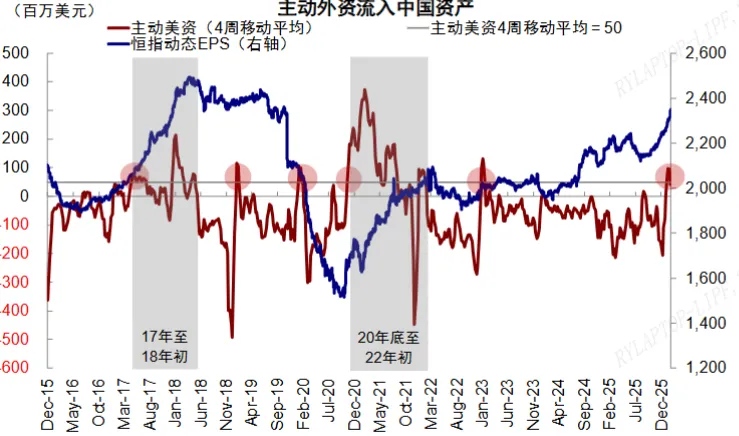 2025年以来,外资对中国资产的配置呈现二元分化格局。被动外资与亚太地区主动外资已率先回流,甚至一度超配中国资产,但欧美长线资金仍明显低配,成为资金回流的潜在空间。值得关注的是,2026年初以来,主动外资连续七周流入中国市场,为2023年2月以来首次,其中欧美主动资金的流入迹象尤为引人瞩目。图1:今年主动外资开始连续流入港股复盘历史经验,欧美主动外资流入的核心驱动始终是基本面改善。2016年以来,主动美资曾有两轮持续流入周期:2017年5月至2018年5月的供给侧改革周期,以及2020年11月至2022年2月的疫情后复苏周期,均伴随企业盈利的显著提升。图2:近年来主动美资持续流入中国资产的时间通常在基本面改善的时候当前,EPFR口径下主动外资对中国权益资产仍低配约1.01ppt,若全部回归标配,有望带来5000-5500亿港元流入,规模相当于2022年3月至2025年底外资流出总和。图3:配置比例来看,目前主动外资对中国权益资产仍低配
