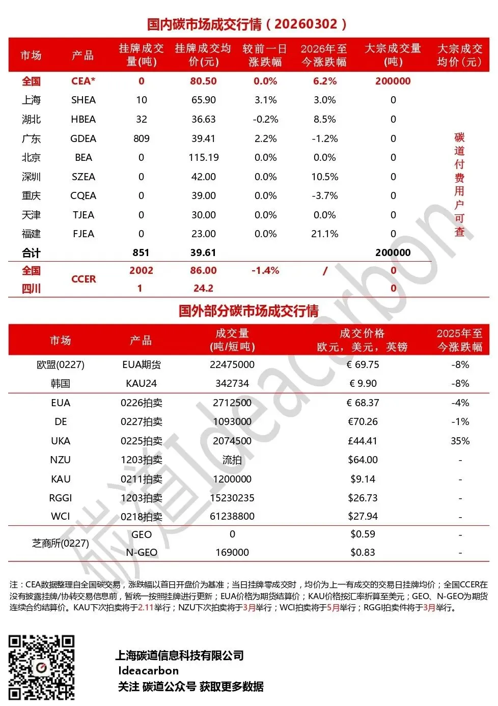 每日碳市场成交行情(20260302)