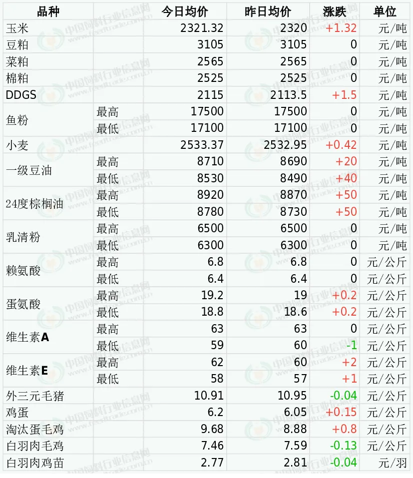 2日DDGS价格局部小涨。下游市场观望心态较浓,市场走货情况表现一般,而原粮玉米价格上涨,外加豆粕价格上调,一定程度刺激下游刚需采购。综合多方因素影响,我们预判2月份上半月期间大多数时候DDGS交易价格总体稳定走势为主下半月略显偏弱走势为主的可能性更大,月度均价环比继续下跌的几率依旧更高。受美国生物燃料需求前景明朗提振,CBOT大豆期货基准期约收高0.6%,创下2024年6月中旬以来的最高水平。美豆高位运行提升成本端支撑力度,但现货需求清淡后价格偏弱削减市场看涨信心。进口大豆受美盘带动上涨幅度受限,国内油厂开工率逐渐回升,在供应充裕的情况下豆粕产量将逐渐增加,但饲料养殖企业和贸易商多以消化节前库存为主,观望心态明显,采购积极性不高,豆粕库存处于偏高水平,价格继续回调,市场重点关注进口大豆通关政策以及进口大豆复拍进展。今日棉粕市场价格稳定为主。国内油厂开工率逐步恢复,豆粕库存远高于同期水平,下游库存充足,采购积极性不高,粕价承压回落,利空棉粕。而棉粕产出恢复慢,供应端压力不大。需求端,对棉粕需求保持平稳,无明显增量。预计棉粕价格震荡调整。今日郑州菜粕期货低开后震荡调整。加拿大油菜籽期货上涨,基准期约收高0.15%,主要反映了芝加哥大豆和豆油期货走强,国际原油上涨,对中国的油菜籽出口前景改善。不过多头获利平仓抛售,制约大盘的上涨势头。菜粕现货偏弱持稳,我国对加菜粕反歧视关税取消,加菜籽关税回降,增加远期供应压力。需求方面处于水产需求淡季,菜粕刚性需求为主。短期菜粕震荡偏弱。外盘方面,秘鲁鱼粉厂商对厄尔尼诺影响的担忧,心态坚挺,其中秘鲁新季超级蒸汽鱼粉预售参考价格为CNF2350美元/吨,南部捕鱼方面,2026年1月-2月26日秘鲁南部捕鱼量共计141656吨,剩余配额数量109344吨。国内进口鱼粉市场,持货商保持挺价意愿,当前秘鲁超级蒸汽鱼粉价格集中在17100-17500元,短期鱼粉偏强走势继续。今日小麦市场价格整体维持平稳,个别企业小幅调整。当前面粉消费正处于淡季,经销商补库量级有限,粉企多维持安全库存,采购策略以观望和按需调整为主,持续提价动力不足。在需求整体放缓的情况下,小麦市场后市存一定压力。上周五CBOT豆油市场继续上涨,强势原油带动豆油走强。上周五马来西亚棕榈油市场止跌回升,由于出口迟滞以及马币走强,棕榈油市场录得10个月内单月最大跌幅。今日油脂市场将重点消化中东局势的影响。受原油强势反弹提振,植物油的生柴需求预期将增强,内外盘植物油市场有望跟随原油上涨。国内基本面偏弱,豆油库存仍处高位、油厂开机逐步恢复,叠加节后消费淡季、下游按需采购,现货上涨乏力。预计近期国内油脂价格或延续稳中偏强。中美贸易冲突缓和,互相取消额外的商船岗务费,国内港口乳清粉到货量趋于好转,大猪仔猪价格低迷,乳清粉市场报价稳中偏弱整理,后续需注意关税谈判进展以及港口库存量等因素。2025年12月,我国赖氨酸与赖氨酸盐及酯的出口量为9.8万吨,同比增0.4%,环比增8.4%。11月万里润达氨基酸生产线计划阶段性升级检修。2月25日起星湖伊品计划对赖氨酸、苏氨酸及小品种氨基酸上调50-300元/吨。2025年12月国内蛋氨酸进口量为2.1万吨,同比增10.6%,环比增66%.市场称希杰马来西亚蛋氨酸工厂12月至2026年1月初检修,新和成固蛋工厂部分生产线计划1月中下旬开始停产检修2-3周。12月31日市场称新和成固蛋提价至18.5元/公斤。1月8日市场称宁夏紫光蛋氨酸价格上调7%。1月30日市场称安迪苏液蛋提价10%。2月3日起新和成固蛋出口报价提升8%。2月27日市场称安迪苏液蛋计划提价1元/公斤。欧洲VA1000市场报价15-16欧元/公斤。10月28日市场称部分厂家报价提至70-72元/公斤。2026年1月6日新和成VA提价至70元/公斤。2026年1月15日市场称浙江医药VA提价至75元/公斤。欧洲VE市场报价5.5-5.8欧元/公斤。1月13日市场称浙江医药VE产品提价至72元/公斤。1月22日市场称浙江医药昌海生物分公司计划自2月初起停产约4周。2月5日市场称新和成VE产品出口报价上调15%。市场偏强运行。全国均价为 10.91元/公斤,较昨日价格下跌0.34%。受集团场出栏小幅收缩叠加二育入场推动,大猪价格在经历了节后的短暂回落后出现止跌回涨态势。但终端消费仍处淡季、冻品库存偏高,反弹力度有限,预计近期低位震荡,大跌空间已不大。今日鸡蛋价格小幅上涨。鸡蛋库存小幅下降,叠加养殖环节因低价出现惜售情绪,对价格形成一定支撑。鸡蛋市场逐步恢复流通,价格小幅上调。综合来看,当前处于春节后消费淡季,供应端依旧充裕,短期以区间震荡偏强为主,大涨条件不足。今日主产区山东鸡蛋均价6.11元/公斤,较昨日价格上涨0.22;河北鸡蛋均价5.87元/公斤,较昨日价格上涨0.15;广东鸡蛋均价6.47元/公斤,与昨日价格持平;北京鸡蛋均价6.32元/公斤,较昨日价格上涨0.20。全国淘汰蛋毛鸡均价强势上涨。鸡蛋小幅上涨,养殖户惜淘、延淘、换羽增多,淘汰老鸡货源偏紧,叠加屠宰企业复工采购积极、蛋价企稳提振养殖端信心,共同支撑价格走高,短期将维持震荡偏强,若出现集中出栏或采购放缓,价格存在小幅回调可能。今日山东地区淘汰蛋毛鸡均价10.20元/公斤,较昨日价格上涨0.66;江苏地区淘汰蛋毛鸡均价10.40元/公斤,较昨日价格上涨0.42;辽宁地区淘汰蛋毛鸡均价9.80元/公斤,较昨日价格上涨1.