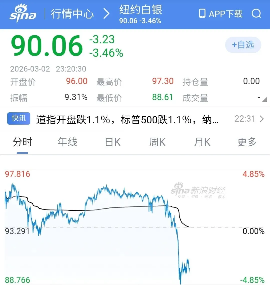 纽约白银现报90.06,较早开盘价96.00大跌-5.94,跌幅-3.46%;盘中最高触及97.30,最低下探至88.61,振幅高达9.31%。