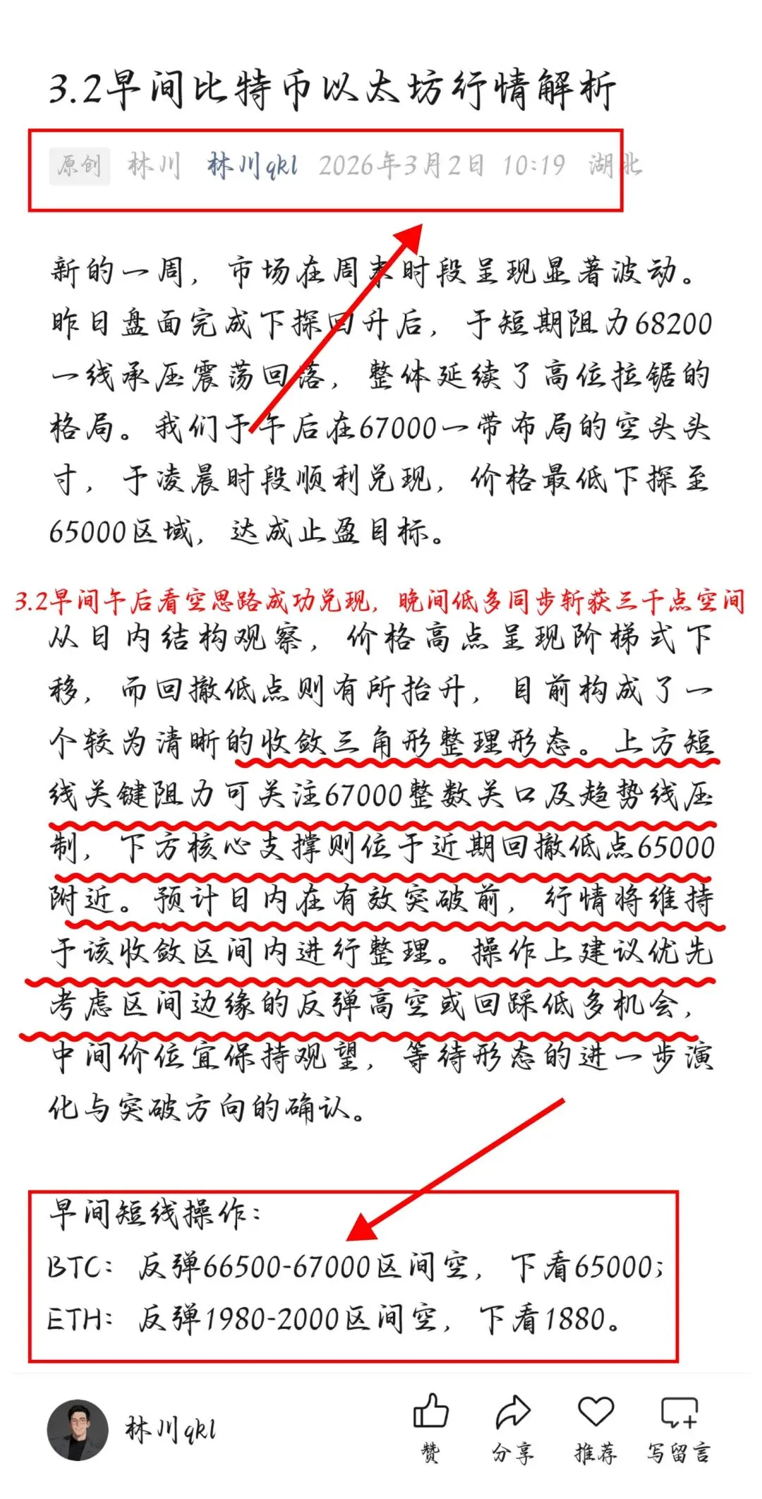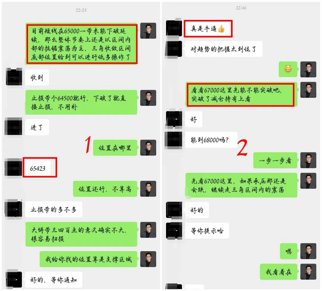 晚间,行情在65000美元关键支撑位止跌反弹,我们随即提示转向低多布局。伴随买盘力量强势回归,价格一路拉升并突破69500美元,多单再度成功捕获近3000点盈利空间。全日先空后多,精准契合研判路径,实现双向斩获。